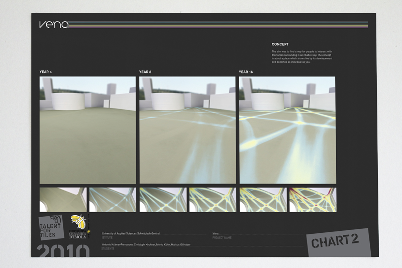 Um das Wachstum des Platzes sichtbar zu machen kann jede Schicht eine beliebige Farbe erhalten um so den Platz für jede Stadt einzigartig zu machen. Das Konzept "Vena" gewann den ersten Platz bei dem Wettbewerb.